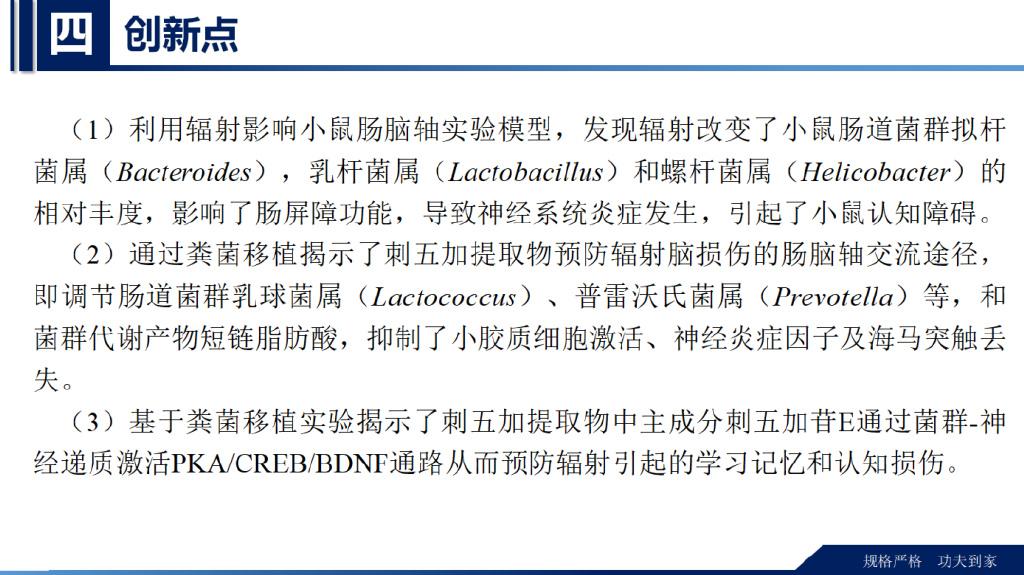 经过论述各不相同普及使用量对小鼠活动学,人体生物学依据,团体破损相比较,推断社会认知的破损和消化道菌群的失衡两者直接关系紧密。保持论述普及干扰小鼠肠脑轴研究三维模型。 再此建模方法基础知识上,凭借多种使用量多种给药时间对刺五加提现物参与继续补充,相比较普及小鼠攻击行为学,生理问题学,企业拉伤的检测可是,确定好刺五加提现物对胃肠菌群干扰延长了普及小鼠专业学习记忆实力。04创新点